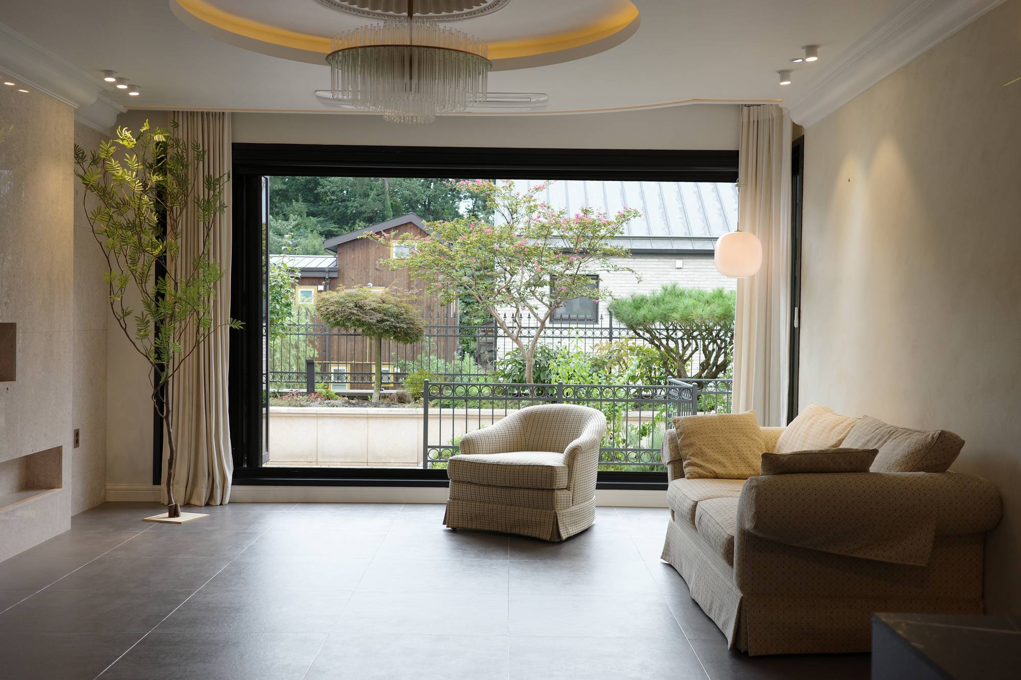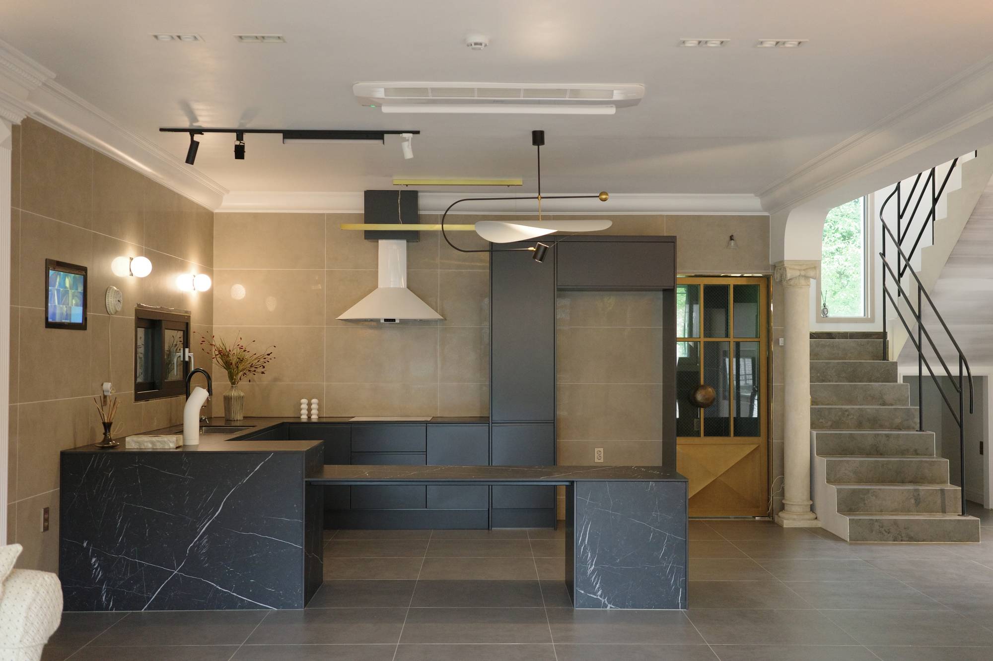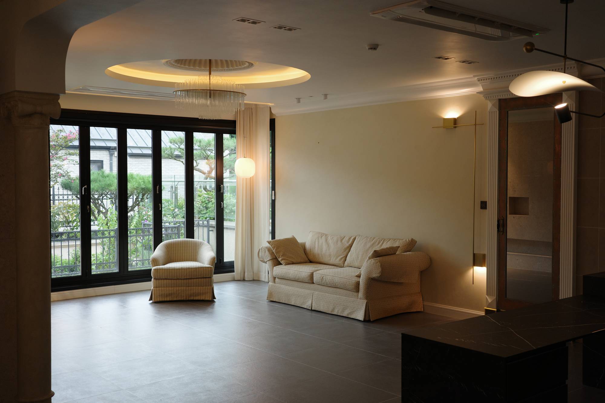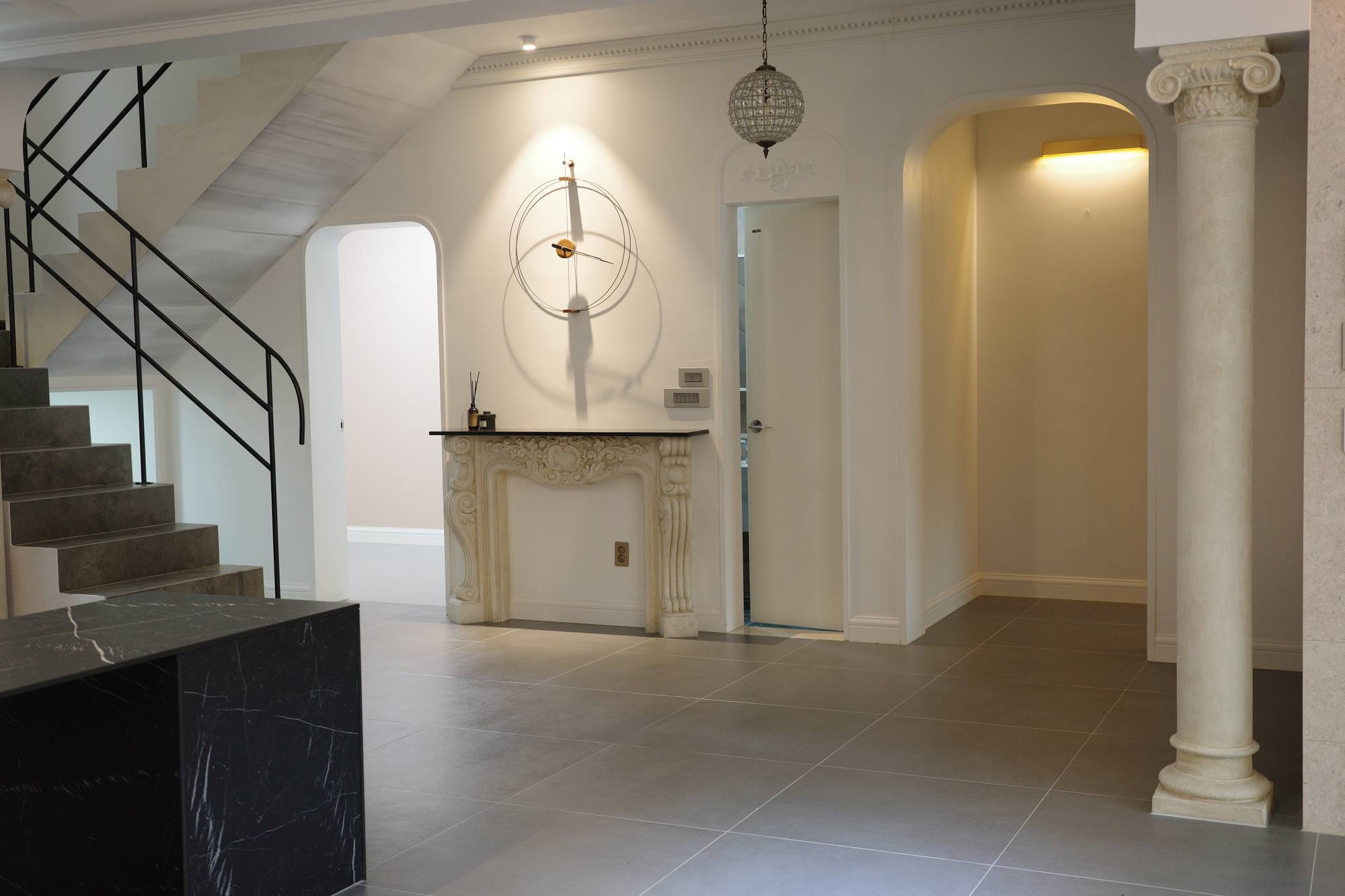높은 층고와 정돈된 서양식의 인테리어는 공간에 탁 트인 개방감을 더하고, 대리석과 타일 마감재가 주가되어 이국적이고 세련된 이미지를 연출하실 수 있습니다.
